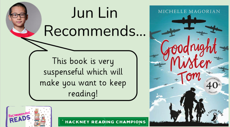 I am Shannon and I am linking with the reading champions. I am going to write to you about one of the champ's book recommendations- Jun-Lin's book was Goodnight Mister Tom by Michelle Magorian. He said his book was great for Year 6 because it can get quite sad and deep so that means something bad might happen. Also the book is set in WW2 which can be a very touching subject. In the story, Will goes to the countryside to live with grumpy Tom. Jun-Lin says he does not like this book... he loves this book because it is interesting and touching.You can find this book in the school library so I hope you read this book.