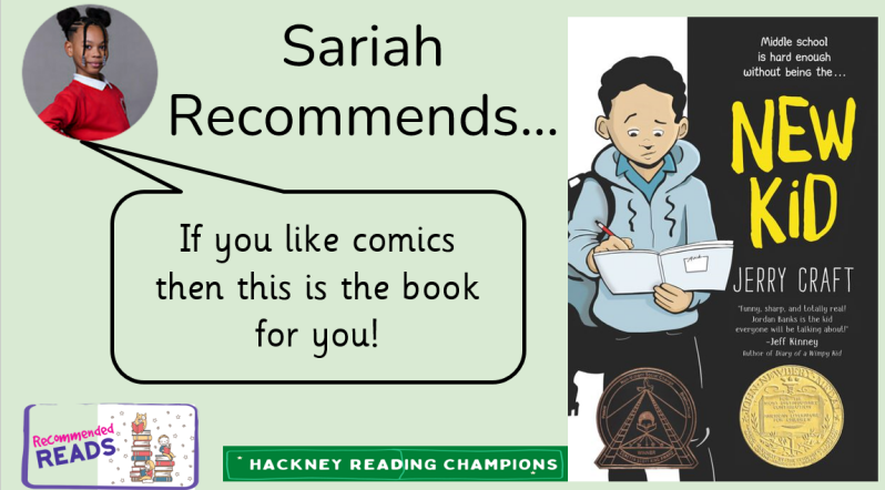 Sariah , our reading champion, recommends New Kid by Jerry Craft . It is a comic and a mystery and is all about a kid that struggles to fit in a new school. It is an easy read but very interesting. She promises you won't be disappointed!