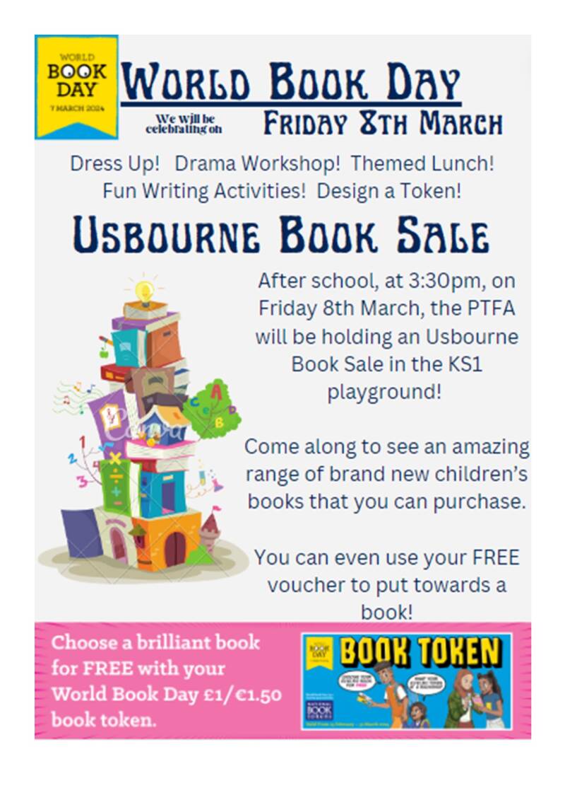 After school, the PTA will be holding a book sale in the KS1 playground. Make sure to bring some money in so you can purchase a brand new book!