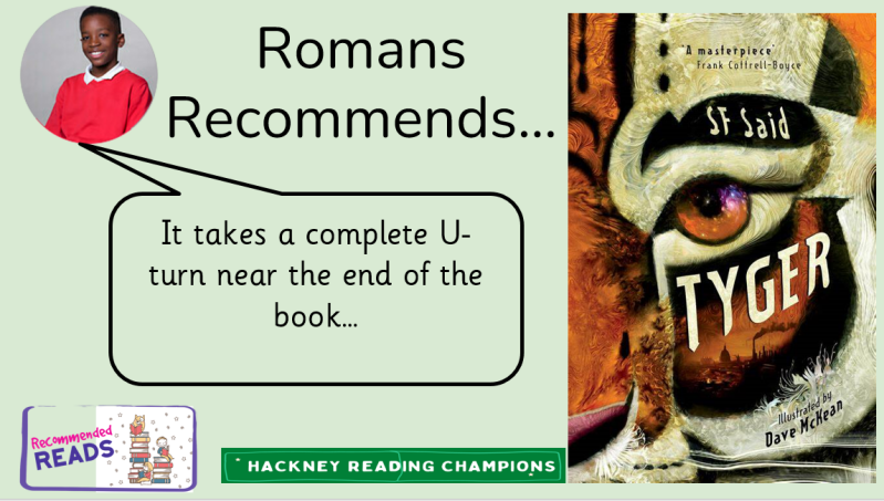 Hello! We have talked to Romans in Year 6 about what book he recommends. He thinks this book is for older children like Year 6. He likes Tyger by SF Said. It is a story about a teenage boy that finds a tiger... but the tiger is in danger . We think that sounds cool and amazing ! You can find it in the library!